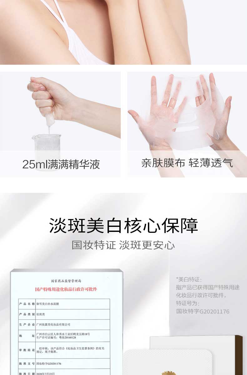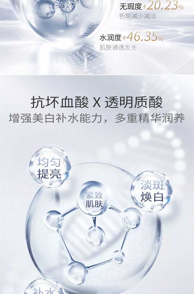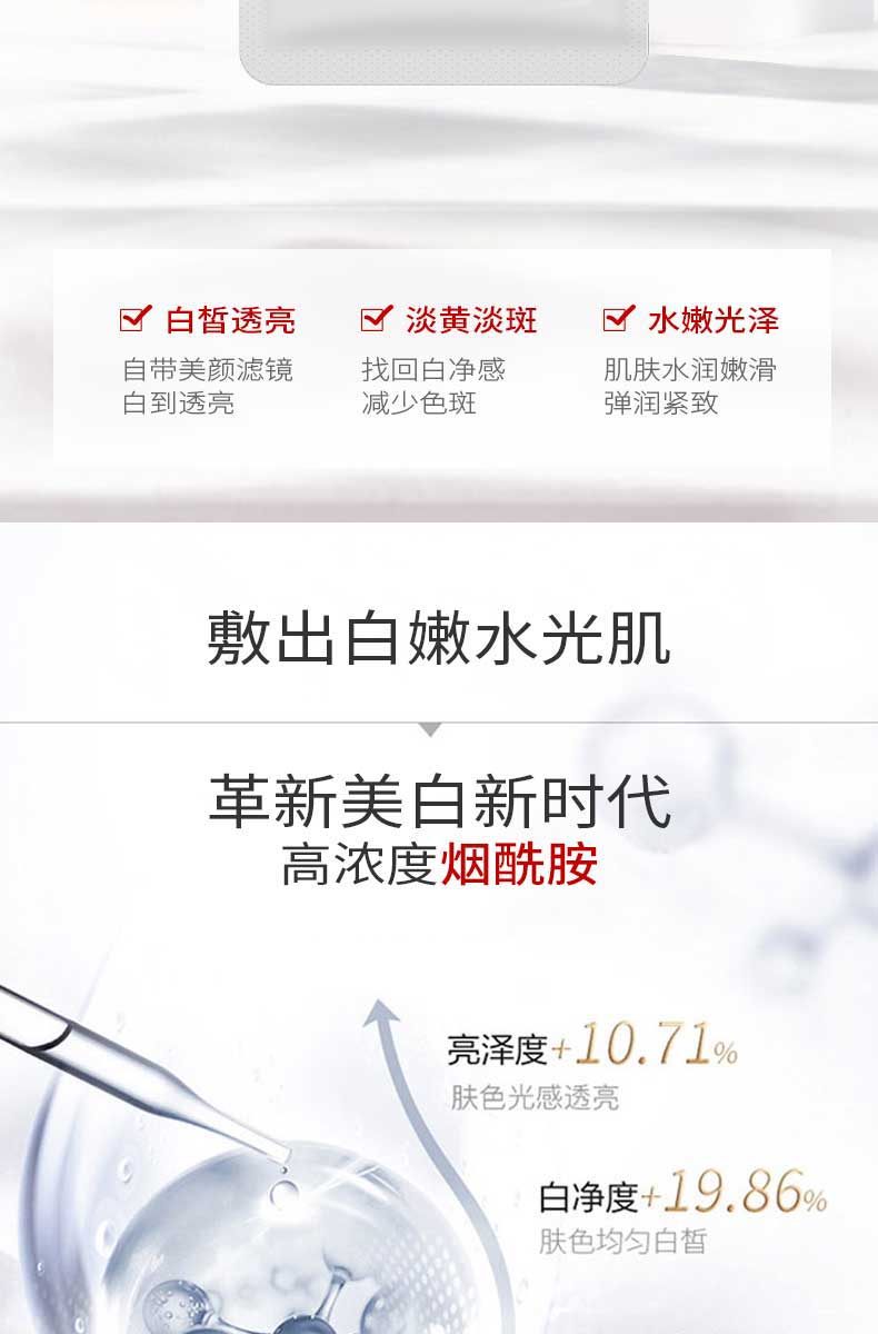 含烟酰胺成分,给肌肤提供营养,提亮肤色,美白淡斑,搭配透明质酸钠,补水滋润,改善粗糙干燥,润滑细纹,