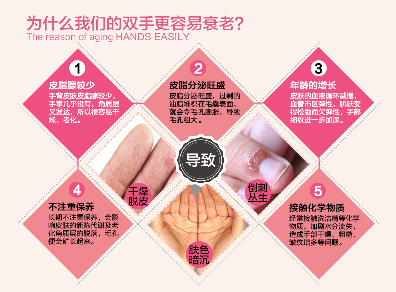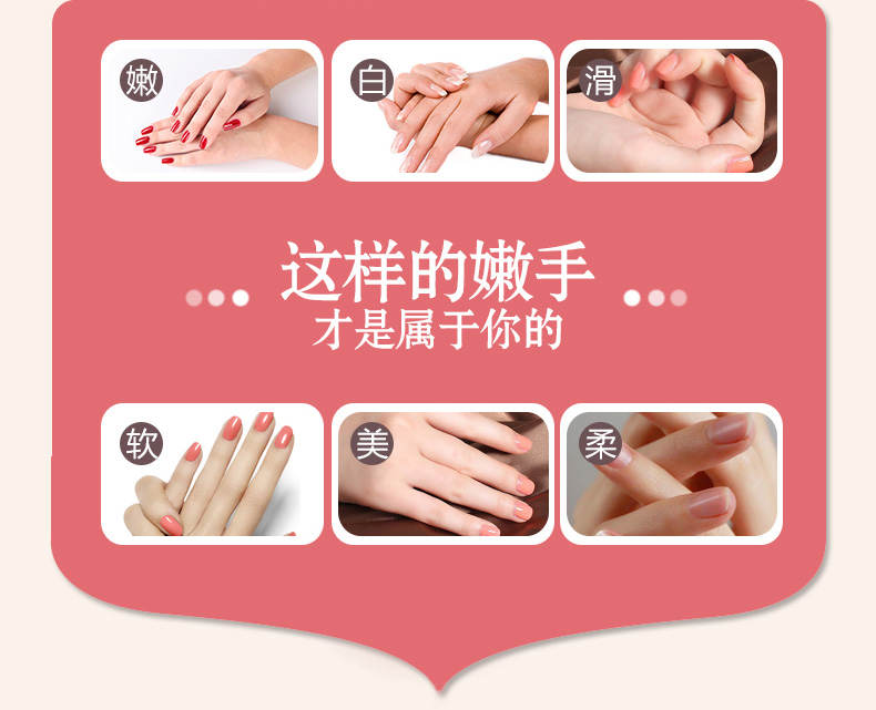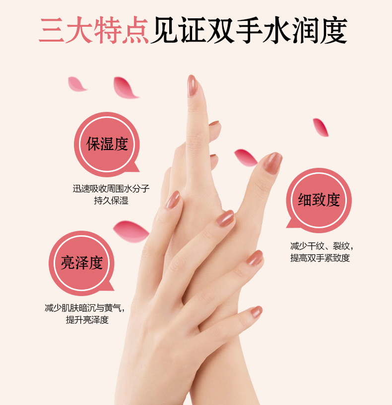 融汇多种营养成分, 帮助肌肤减少水分的流失,层层保湿,补充手部肌肤所需水分和营养,改善缺水受损肤质,解决干燥细纹,增强肌肤弹性,令手部肌肤呈现水润饱满,让你的双手更显柔嫩细滑