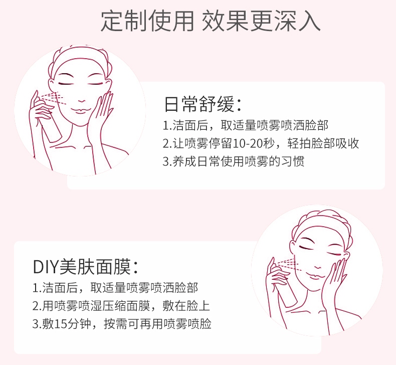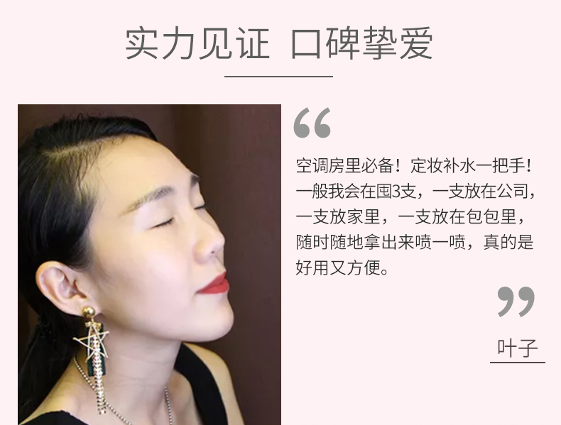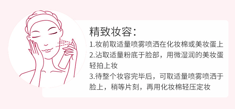 配方蕴含神经酰胺4,带给肌肤轻柔呵护,喷雾细腻轻薄,为肌肤补充水分,细致毛孔,清爽保湿不粘腻,润肤定妆,使妆容更贴合,令肌肤畅享清新喜悦,享受美肌时刻。