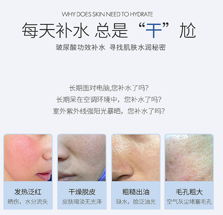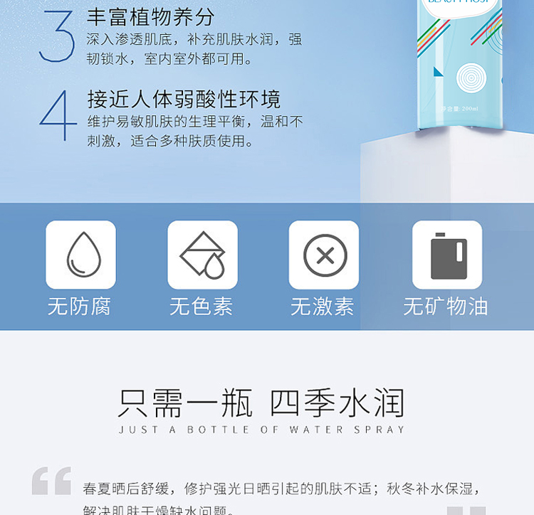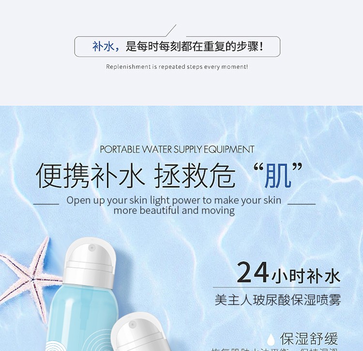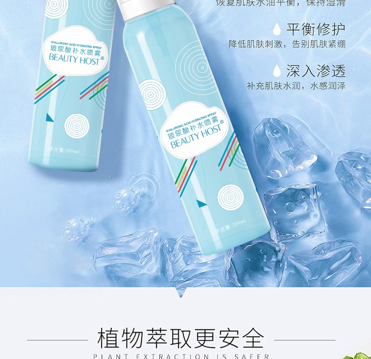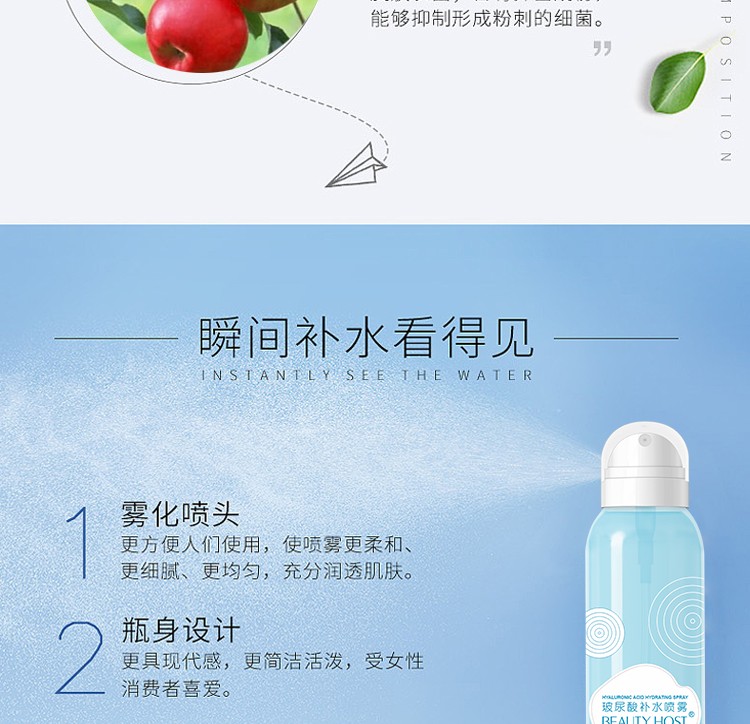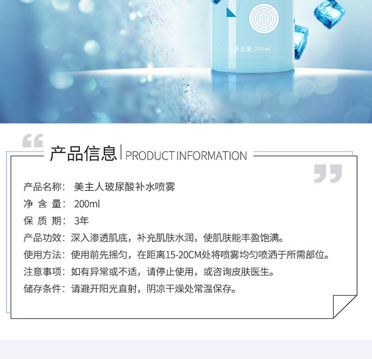 蕴含玻尿酸(透明质酸钠),水润亲肤、改善干燥缺水肌肤,润滑细纹、嘭弹修护水感保湿,喷一喷补水抚慰肌肤,澎湃补水,润泽美肌