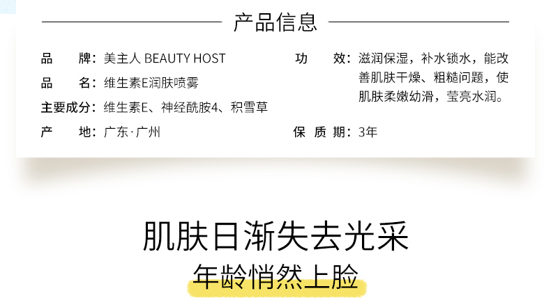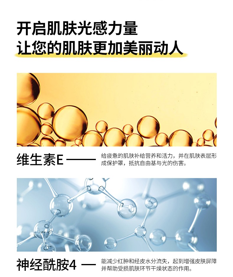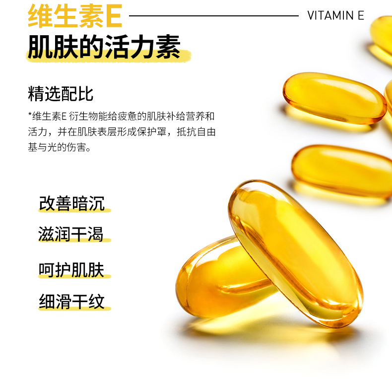 蕴含维生素E(生育酚乙酸脂),滋润保湿、补水锁水、能改善肌肤干燥、粗糙问题、使肌肤柔嫩幼滑,莹亮水润、润肌的秘密,呵护您的娇嫩肌肤。