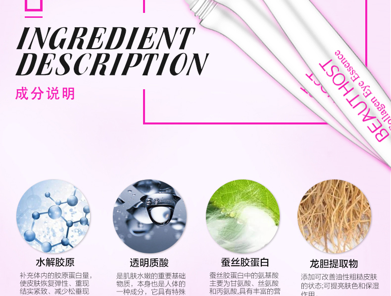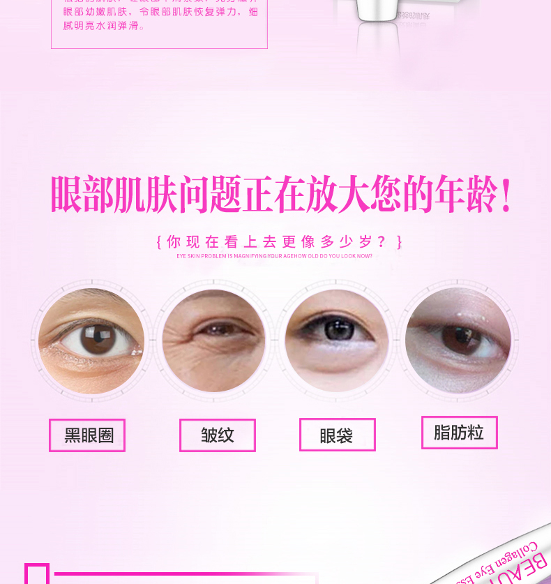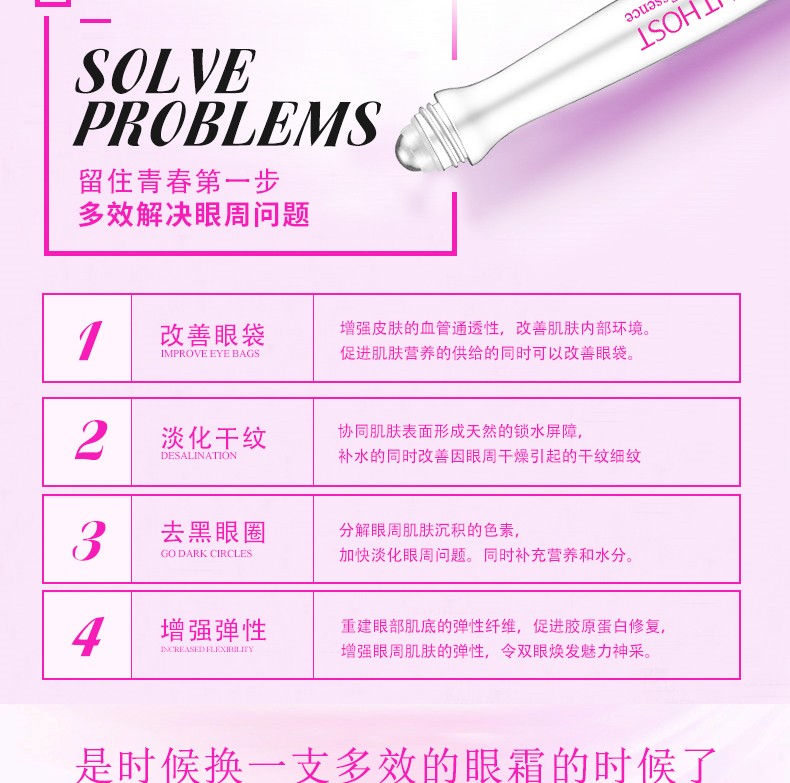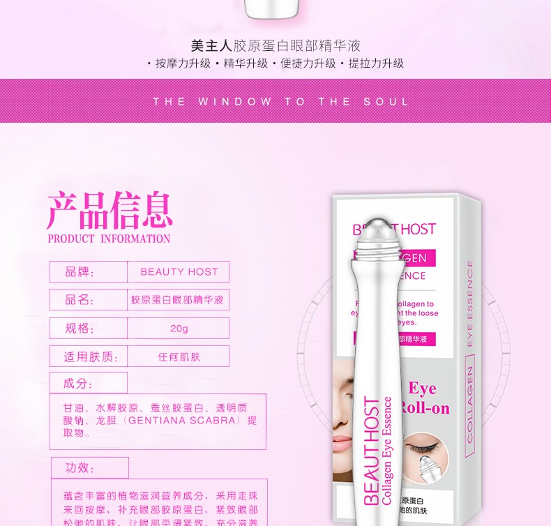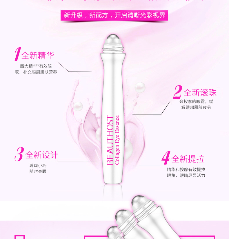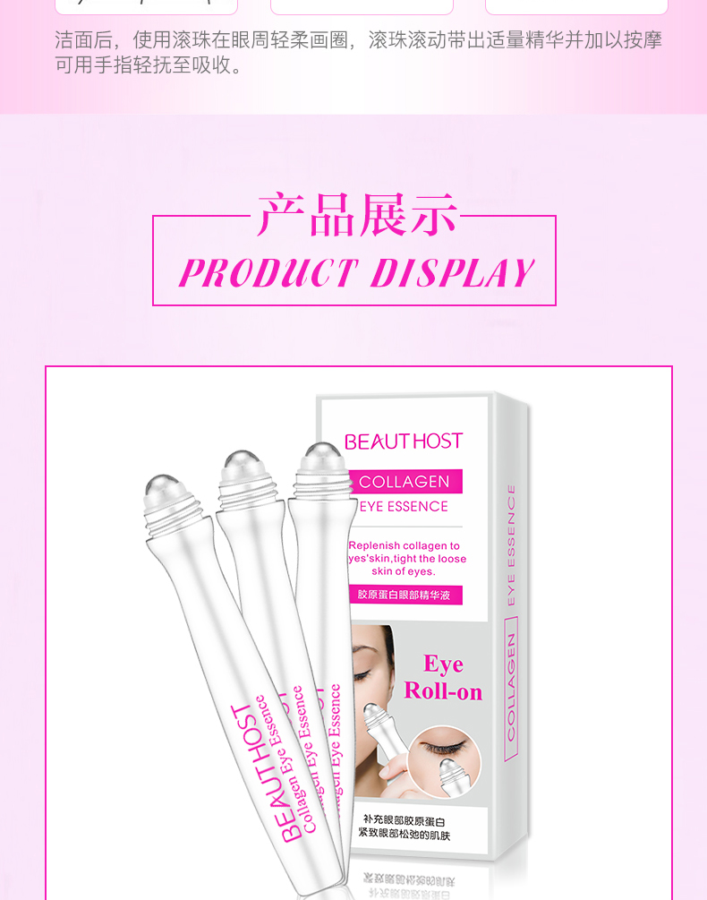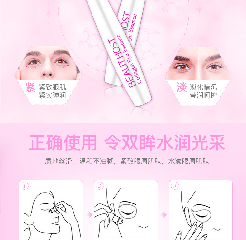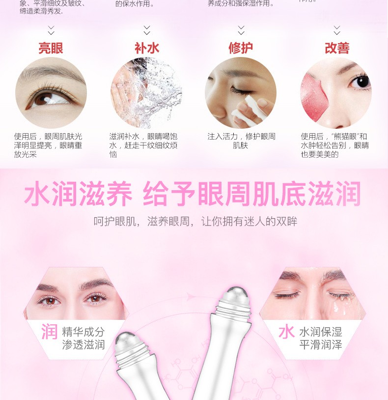 蕴含丰富的植物滋润营养成分,采用走珠来回按摩,迅速补充眼部胶原蛋白,舒张眼部松弛的肌肤,让眼部平滑紧致,充分滋养眼部幼嫩肌肤,令眼部肌肤恢复弹力,细腻明亮水润弹滑。